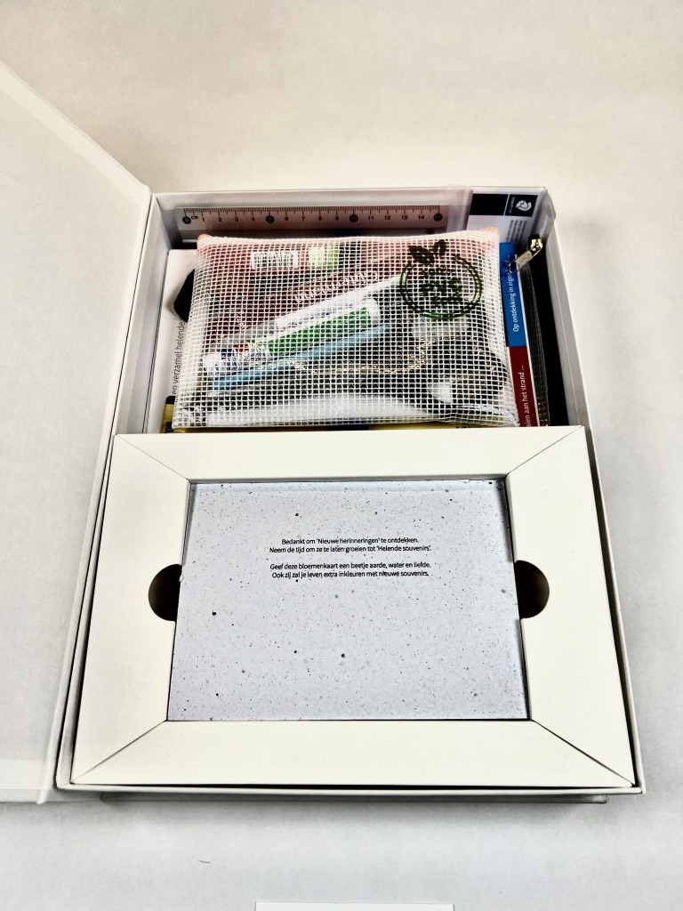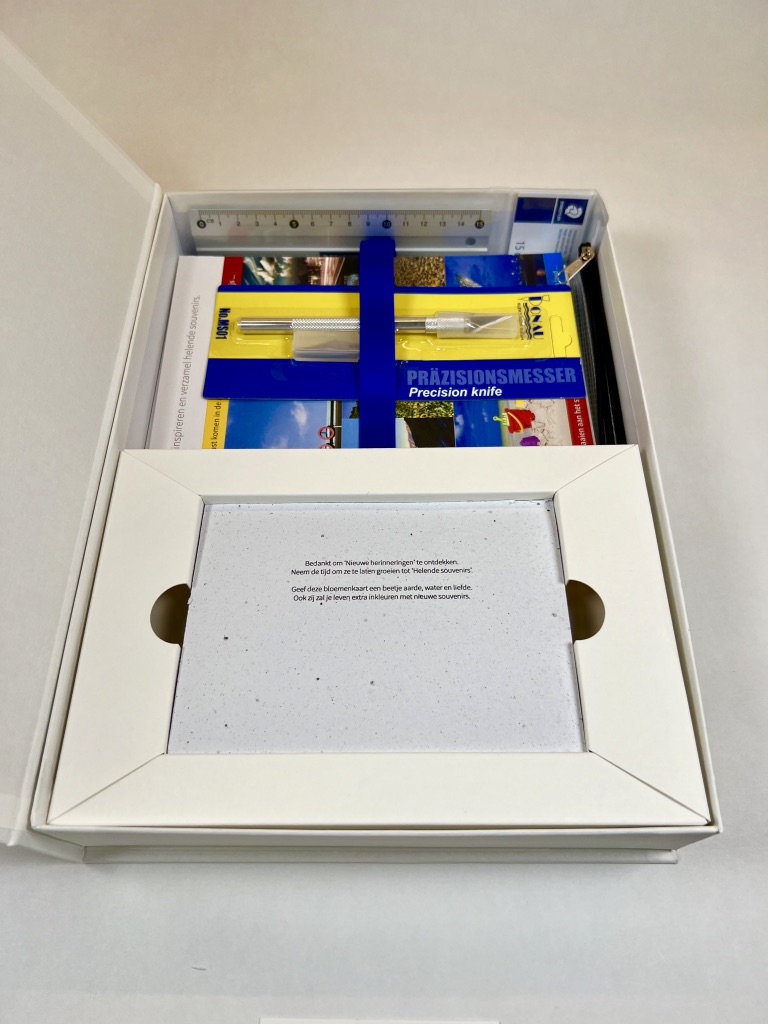 Deze prachtige DIY-box bevat kwaliteitsvolle materialen en tools, handleidingen en voorbeelden, tips en tricks om creatief aan de slag te gaan met een geschikte foto van je verlies en een nieuwe start te nemen … Je kan naar hartenlust knippen, snijden, plakken, kleuren, passen en aanpassen, ontwerpen, uitvoeren, plannen en uitkijken naar je volgende uitstap om geschikte decors te zoeken voor jouw project.